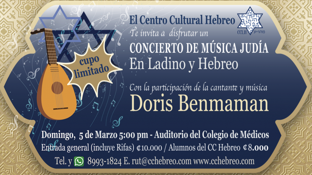 Con un concierto de Música Judía en Ladino y Hebreo, con la cantante internacional judía Doris Benmaman Cohen. Escucharemos la historia de Purim y tendremos rifas y obsequio para los que participen.
